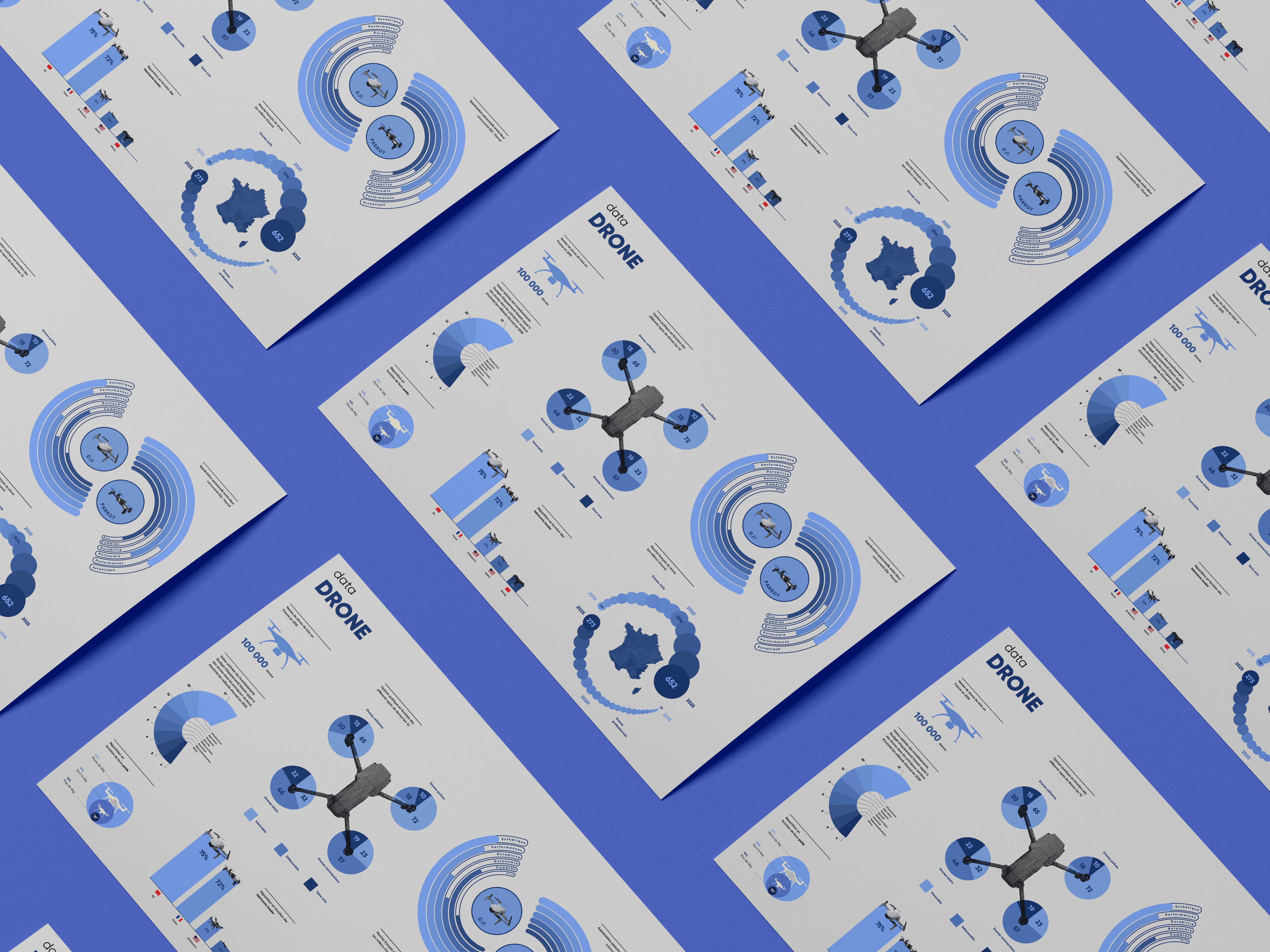 Passionné par les nouvelles technologies, je me suis toujours posé pas mal de questions sur les drones qui était pour moi encore plus ou moins inconnu. Grâce à ce travail, j'ai pu rassembler un bon nombre d'informations qui m'ont permis d'en apprendre bien plus dans ce domaine. J'ai pu donc y retranscrire mes différentes recherches dans cette datavisualisation afin d'avoir plusieurs données importantes en un coup d'œil. Je suis parti sur des nuances de couleurs bleues afin de rappeler la couleur du ciel dans lequel volent les drones. Cela permet d'avoir également une bonne lisibilité de toutes les informations disposées.