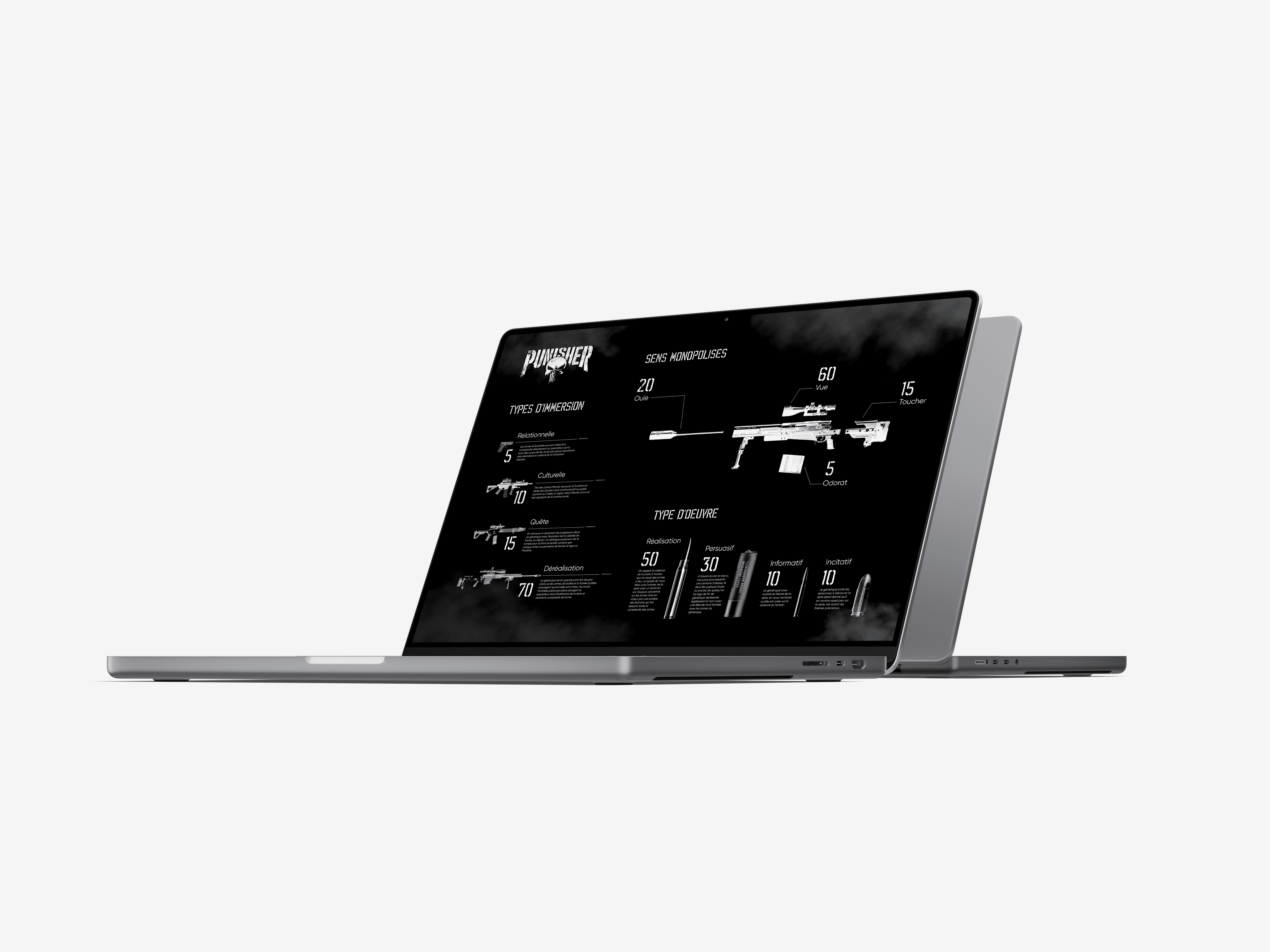 Étant une personne qui apprécie beaucoup le cinéma, aujourd'hui, cela passe également par le petit écran. Les séries sont aujourd'hui très diverses et variées et c'est avec les séries Punisher & Dark que je me suis dirigées. Deux séries particulièrement sombres et violentes exactement comme leurs protagonistes. À travers ces deux datavisualisation. Je suis toujours resté sur l'essentiel que représente la série. Du côté de "Punisher", l'évidence était de prendre tout ce qui touche à l'arme à feu pour retranscrire toutes les données demandées. Du côté de Dark, j'ai choisi de me concentrer sur la partie voyage dans le temps de la série en reprenant le style de frise chronologique du site internet de Dark par Netflix ainsi que la représentation de l'arbre généalogique avec un véritable arbre.